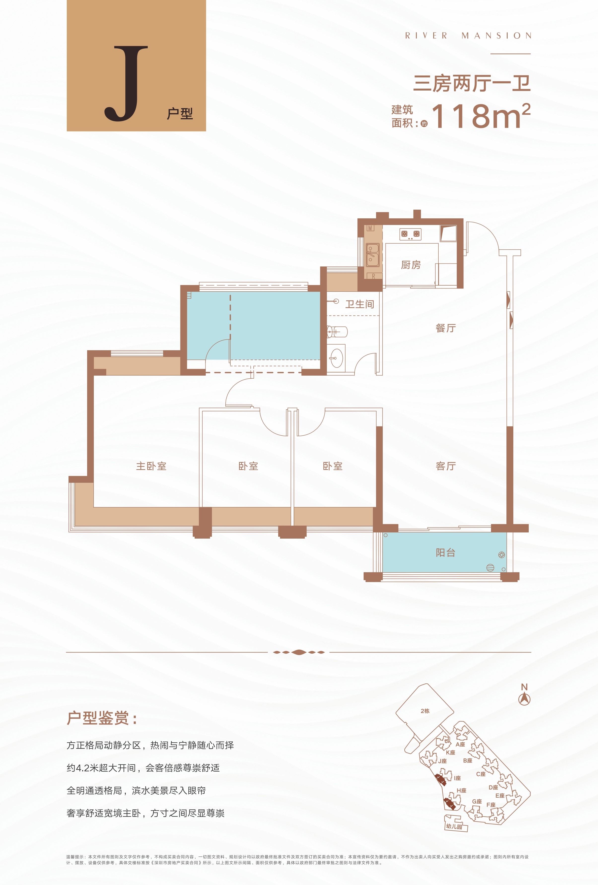 容积率低至 3.36,绿化率高达 40%,享超万方空中园林,外瞰滨河市政公园、河岸休闲景观,尽享舒 适安逸生活。采用围合式布局,最大程度的保障了产品的通风采光,视野景观舒适度最大化。全房飘窗设计,房间通风采光俱佳,充分利用自然风,大大提高了居住舒适度。 全房飘窗、户型方正,空间利用率高;双阳台设计,空间更灵活;动静分区,科学动线规划,居住更舒适。