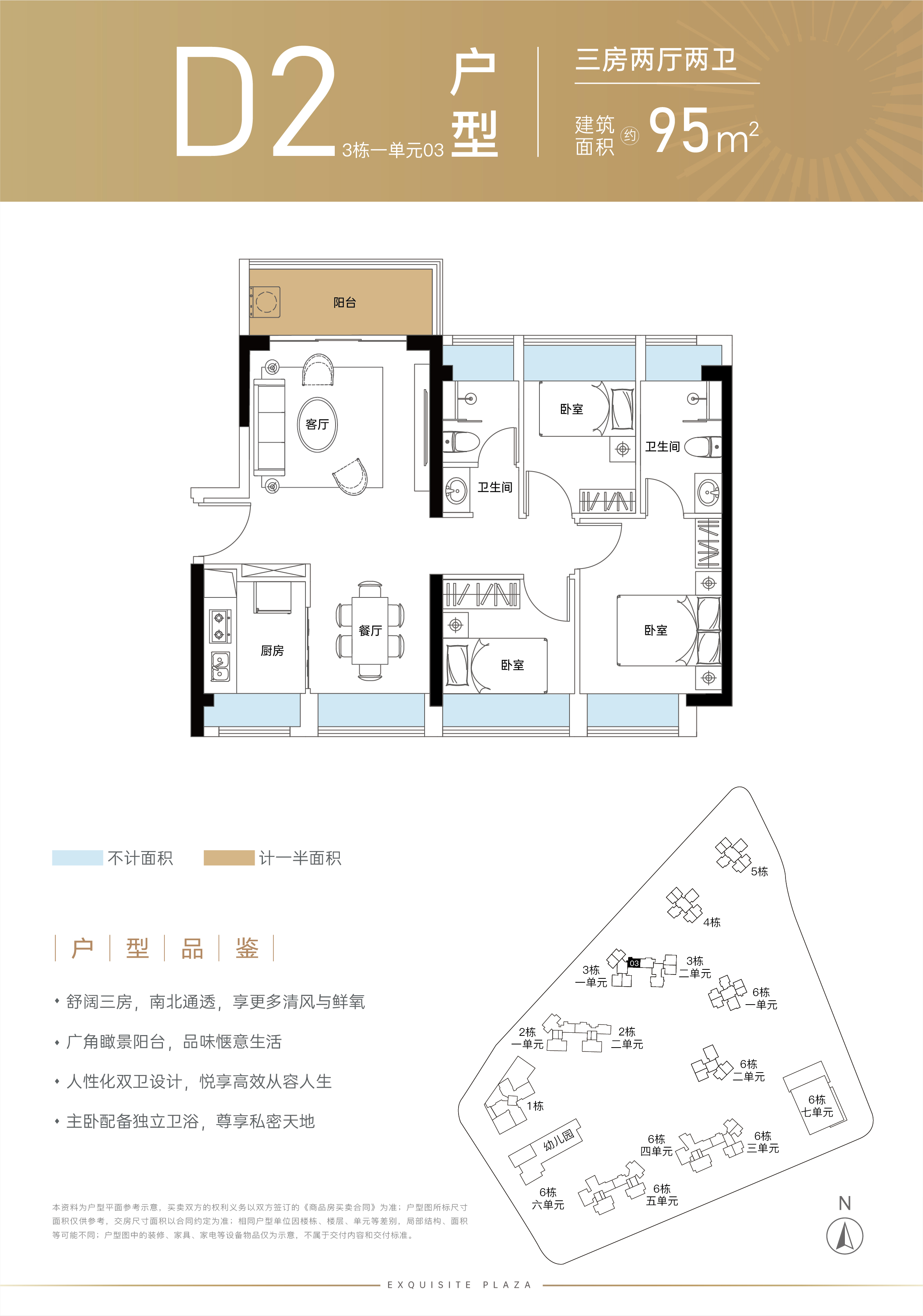 舒阔三房,南北通透,享更多清风与鲜氧 广角瞰景阳台,品味惬意生活 人性化双卫设计,悦享高效从容人生 主卧配备独立卫浴,尊享私密天地