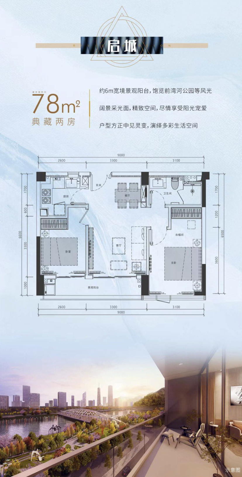 约6m宽境景观阳台,饱览前湾河公园等风光 阔景采光面,精致空间,尽情享受阳光宠爱 户型方正中见灵变,演绎多彩生活空间