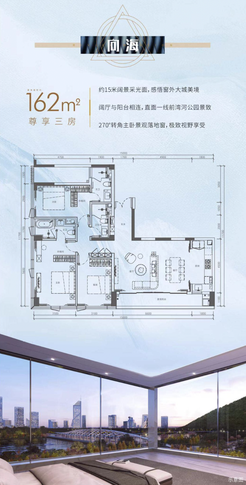 约15米阔景采光面,感悟窗外大城美境 阔厅与阳台相连,直面一线前湾河公园景致 270°转角主卧景观落地窗,极致视野享受