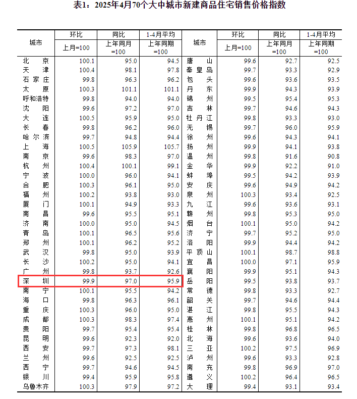 4月,深圳成为一线城市中唯一一个房价双跌的城市。