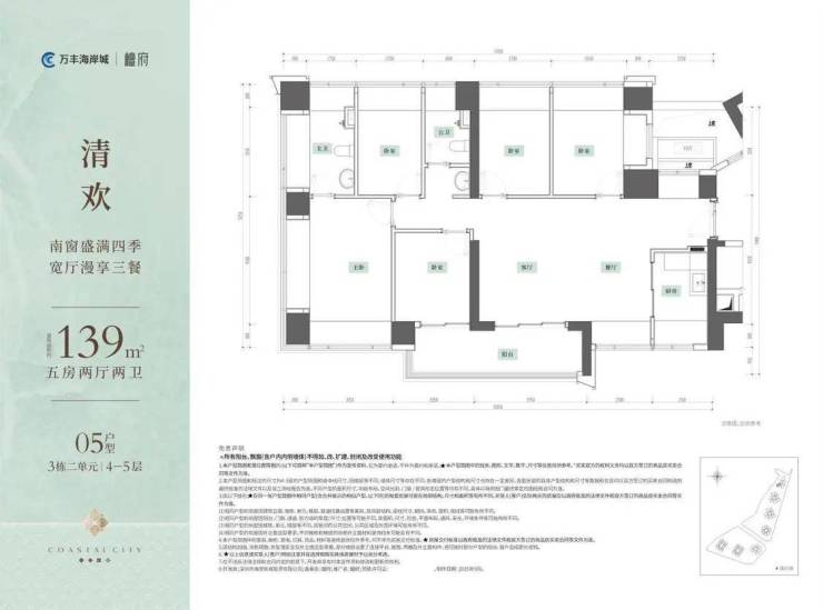 建面约139㎡五房户型,作为片区内稀有的南向横厅设计,拥有超过15米的南向面宽,南北通透,约6.8米开间的景观阳台,将空间尺度与采光观景体验推向了新的高度。