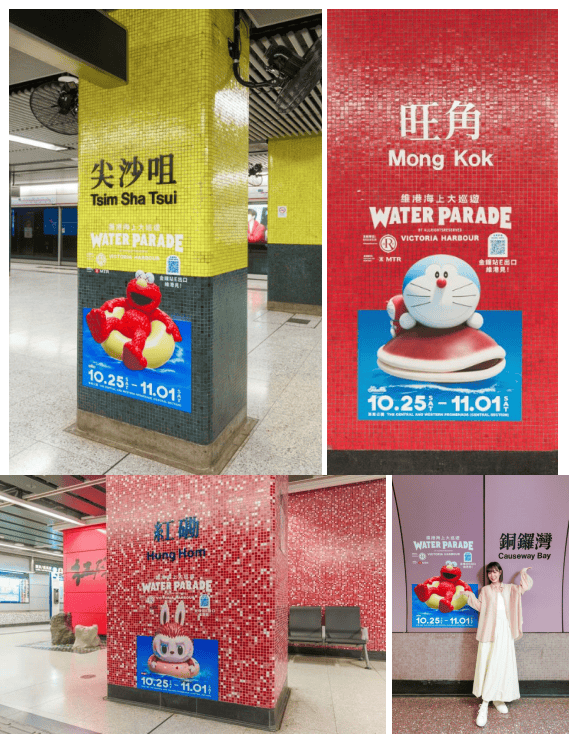 港铁站墙柱上的站名一向是市民及旅客的人气打卡热点,为配合「维港海上大巡游」,港铁特别安排四大角色以活动主题造型亮相,包括抱着豆沙包的多啦A梦、躺在水泡上的滑嘟嘟及KAWS & 芝麻街(Elmo),以及躺在冬甩水泡上的LABUBU,分别出现于中环站、铜锣湾站、尖沙咀站、旺角站及红磡站的墙柱,注入欢乐与活力,让乘客尽情打卡合照,为今次盛事留下美好回忆。而内地访港旅客所途经的落马洲站到境大堂,亦将以四位人气角色造型主题作装饰,热烈欢迎各位旅客乘搭东铁线直达金钟,参与这次全城盛事。