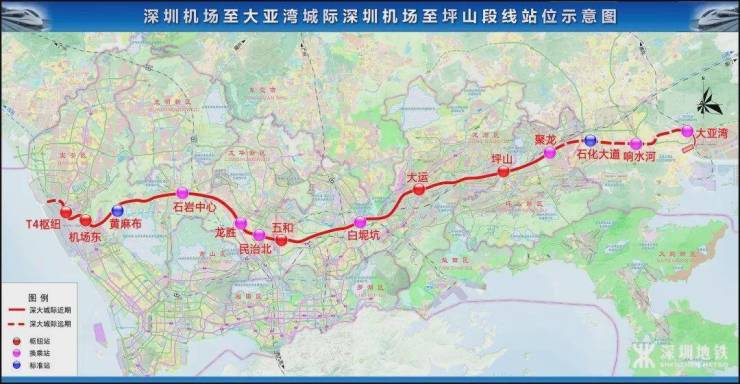 深圳机场至大亚湾城际深圳机场至坪山段工程:线路起自深圳市宝安机场T4枢纽,途径深圳市宝安区、龙华区、龙岗区和坪山区,止至聚龙站,预留远期延伸至大亚湾的条件。线路全长约69公里,设站11座。