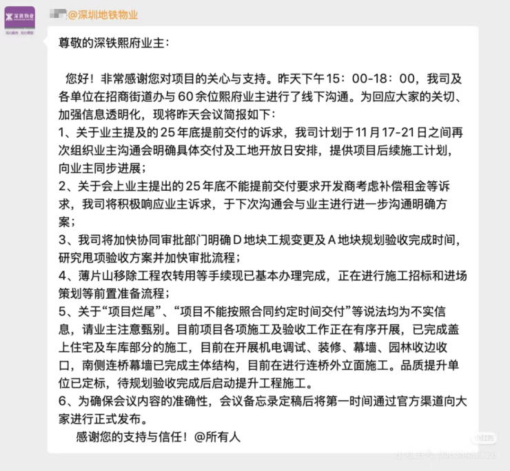 迫于舆论压力,深铁方面作了回应:将于11月17-21日召开沟通会明确交付计划,否认“烂尾”传闻,强调施工正有序推进......