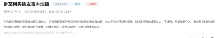今年9月份,绿城桂语兰庭人才房业主投诉,项目卧室使用劣质发霉地板,公共走廊未加装栏杆,存在巨大安全隐患。