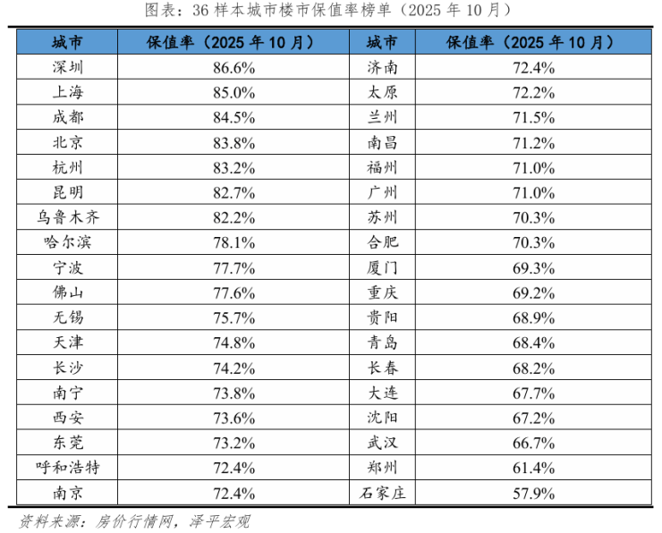 做起来很复杂,花了三个多月时间,咱们直接看结论。我们发现,全国36个重点城市,过去十年深圳的房地产保值率排第一,上海、成都位列前三,北京、杭州也冲进前五,他们的保值率都超过80%。反观有些三四线城市,比如鹤岗、廊坊,保值率早就跌破60%,当年买的房子现在打半价都很难出手。