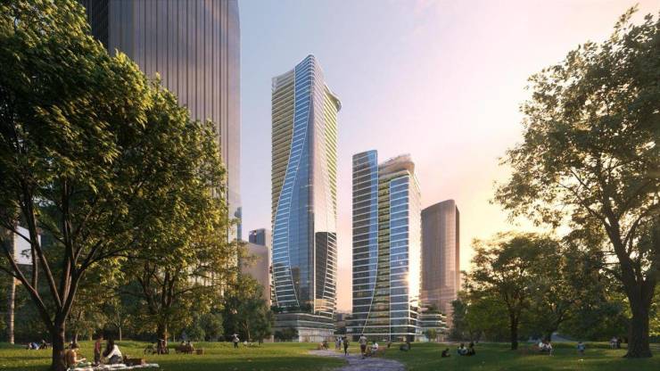 尤为值得一提的是,项目极度注重生态绿色与公共共享。通过打造“呼吸式”的办公环境,将清新空气与自然光线引入建筑每个角落;融入下沉庭院、骑楼界面等岭南特色元素,营造出兼具传统韵味与现代舒适的宜人空间。同时,创新打造“第六立面——融合屋顶公共空间,云端剧场、无边泳池与“生命之树”艺术装置。