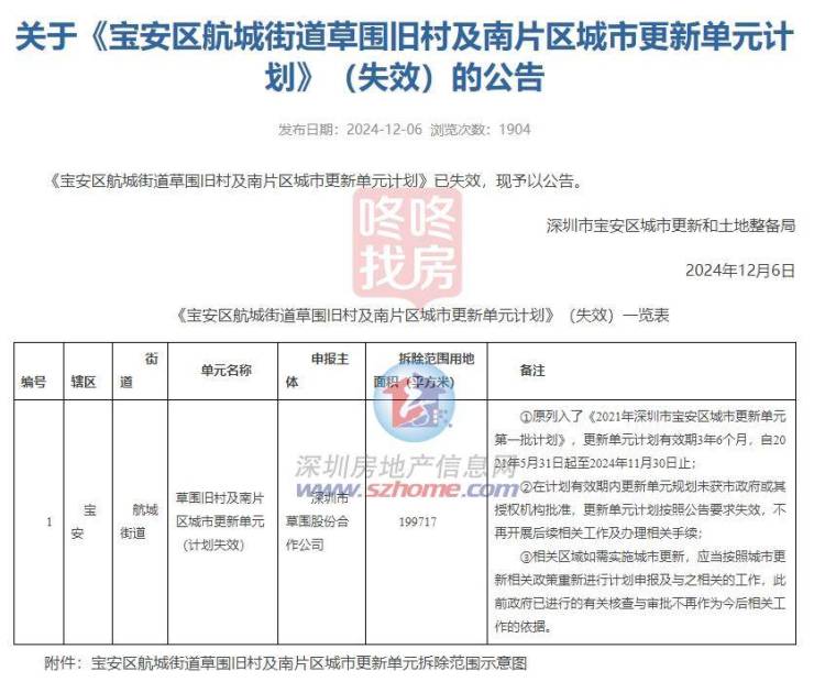 还有两个拆除范围用地面积超过12万平方米的项目,一个是位于航城的“草围旧村及南片区城市更新单元”,该项目拟拆除范围近20万平,项目于2024年12月6日宣告失效。