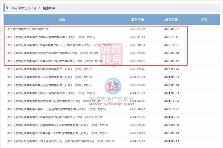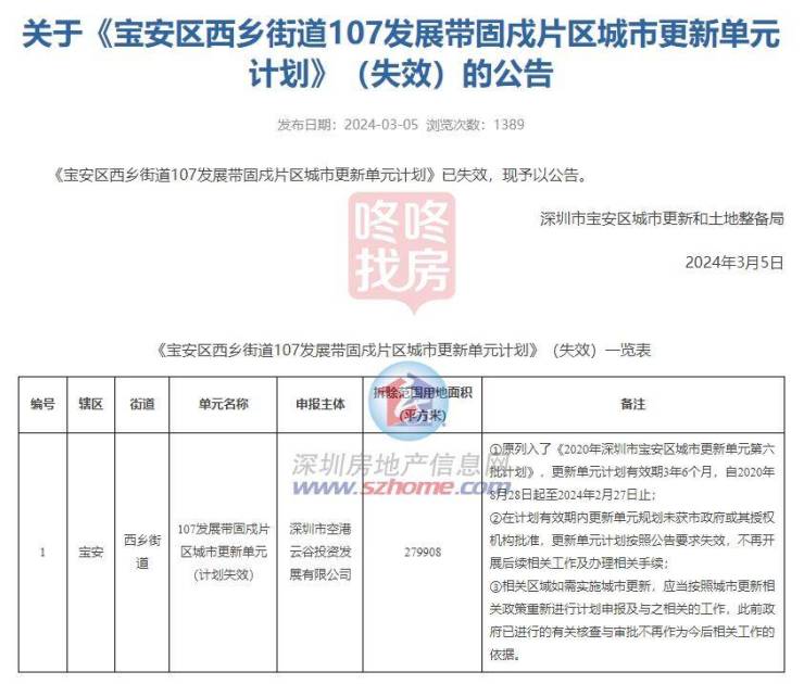 在2024年3月,“宝安区西乡街道107发展带固戍片区城市更新”单元也宣告失效。
