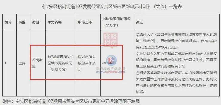 其中规模最大的为“宝安107发展带潭头片区城市更新单元”,已于今年9月12日正式失效。