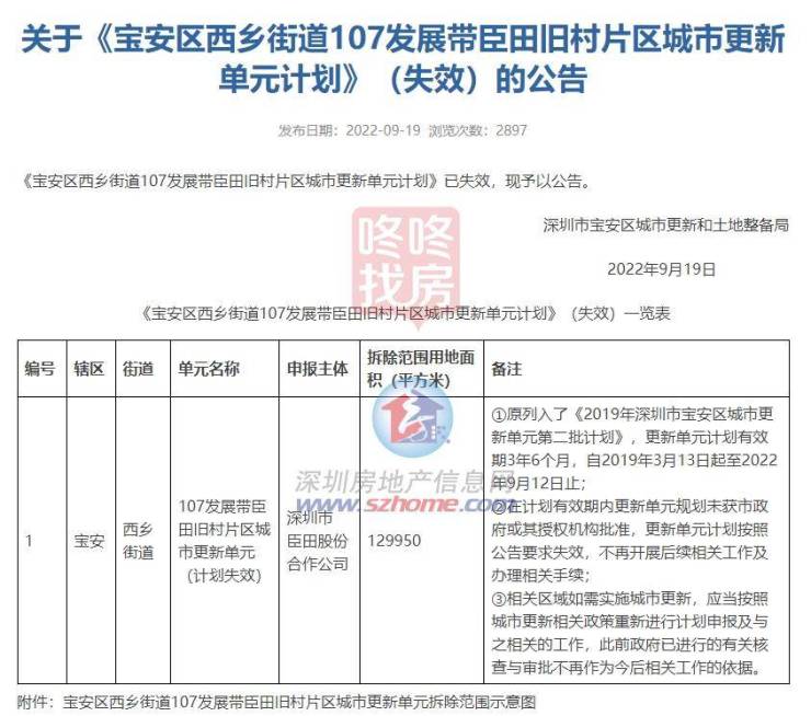 另一个拆除范围达12.9万平的“宝安区西乡街道107发展带臣田旧村片区城市更新”单元,该项目在2022年9月19日宣告失效。