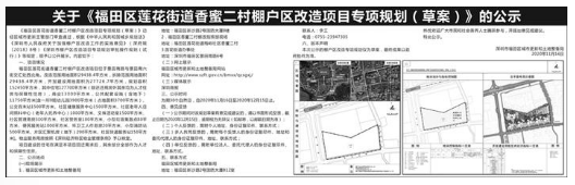 该项目于今年5月7日,深圳市福田区人民政府发布了关于香蜜二村棚改项目的房屋征收决定书;同时,深圳市福田区香蜜二村棚改项目房屋征收补偿方案也进行公示。