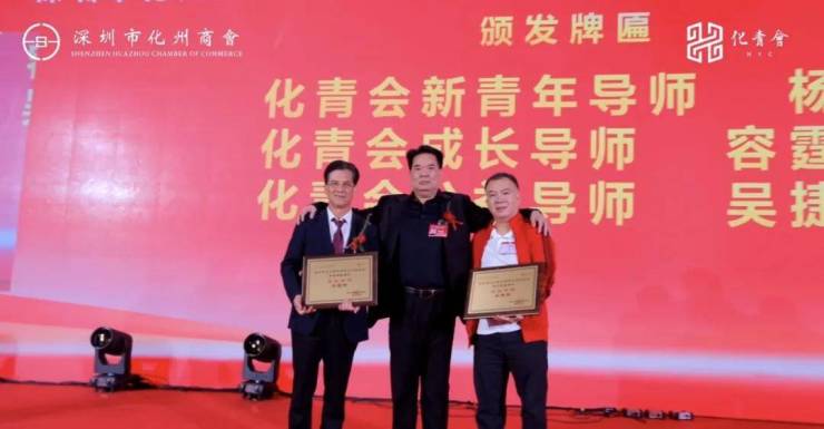 化州市委常委、统战部部长黄勇文先生(中)为深圳化青会荣誉高级顾问黎壮荣先生(左)、陈越先生(右)颁牌