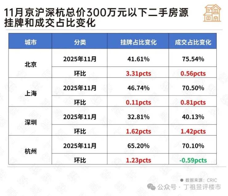 数据显示,北京、上海、深圳和杭州四大城市300万元以下低总价房源挂牌占比较上月均有所上升,环比分别增3.31个百分点、0.11个百分点、1.62个百分点和1.23个百分点。刚需总价段房源业主挂牌积极性回升,且增幅显著,低总价业主抛售心理加剧。