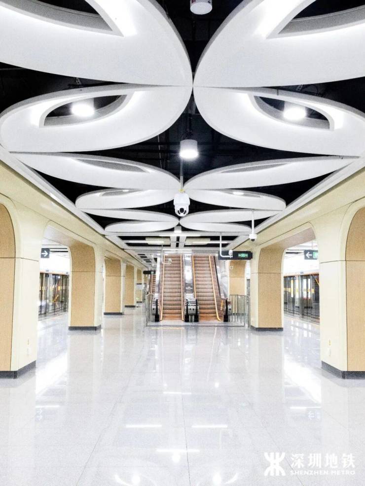 毗邻大疆、鹏城实验室等科技地标,车站以“科技无境·探索不止”为主题,顶部设计融入无人机流线与螺旋桨灵感,配合流动灯光,仿佛置身未来空间。
