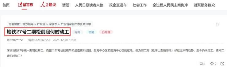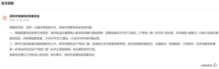 在领导留言板上,官方针对27号线二期的动工时间是这样答复的:已启动轨道五期修编研究工作.....进一步深化研究论证27号线二期(松坪山至前海段)的必要性和可行性。