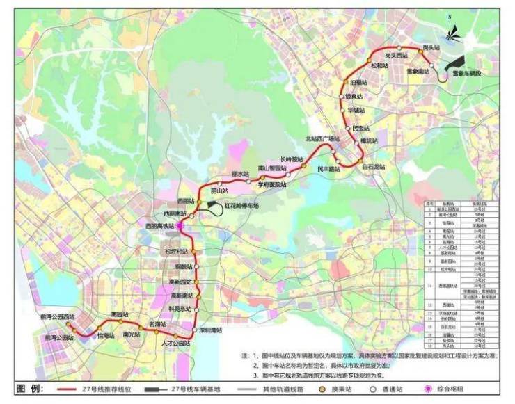 27号线一期:起自前海前湾片区,终至龙岗坂雪岗片区,串联前海、南山、粤海、西丽、民治、龙华、坂田等片区,线路全长约25.3公里,设站20座。