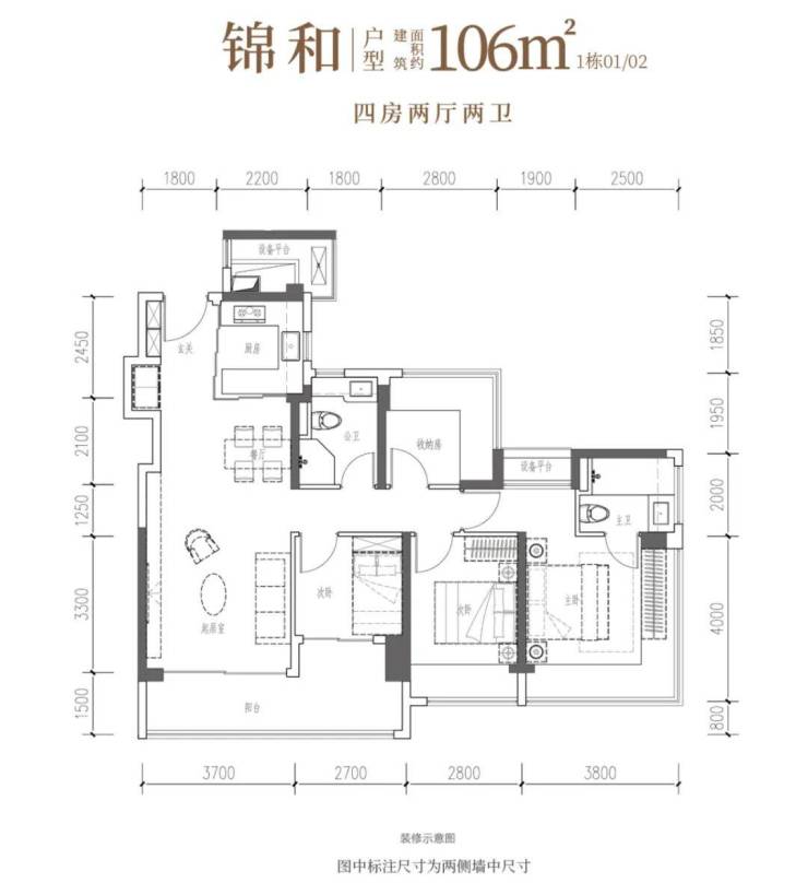 约106㎡:客厅开间约3.7米,四开间朝南,主卧带转角飘窗,得房率约101.16%。
