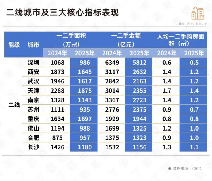 从人均一二手购房面积看,天津、西安、武汉人均面积均超过1.2平方米,而深圳人均面积仅0.5平方米,苏州降至0.7平方米。