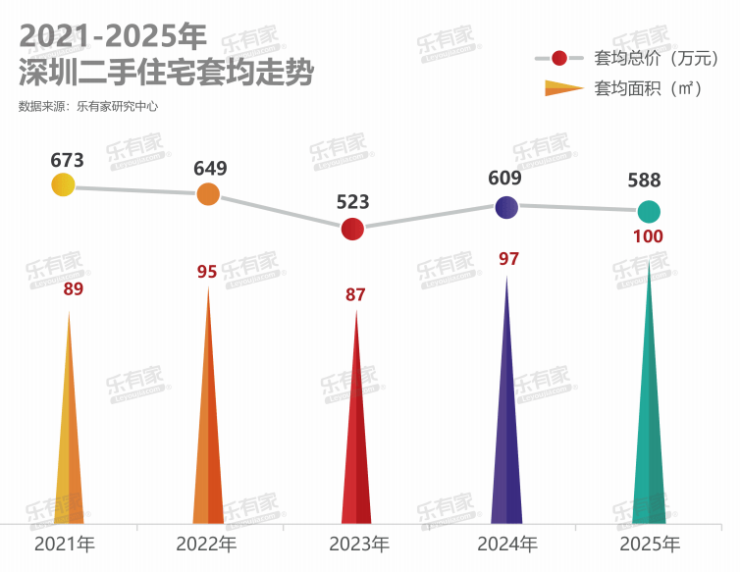 5年时间,2025年深圳二手房套均面积涨至100㎡,同比扩大了11个平米,总价降至588万。