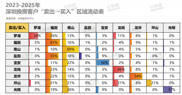 乐有家数据显示,除了“同区置换”之外,核心区的福田、南山成为最受欢迎的置业迁入地。
