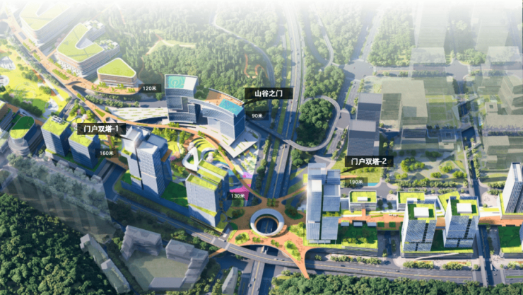 跨玉平大道的门户双塔相互呼应,以“山谷之门”的设计凸显片区辨识度,打造科技感与地标性兼具的城市入口。