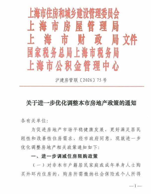 2月25日,上海楼市扔出一枚深水炸弹,五部门联合印发了《关于进一步优化调整本市房地产政策的通知》,该通知自2026年2月26日起施行。