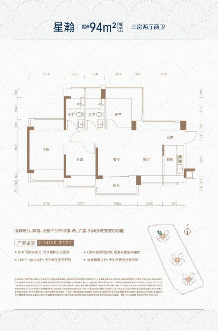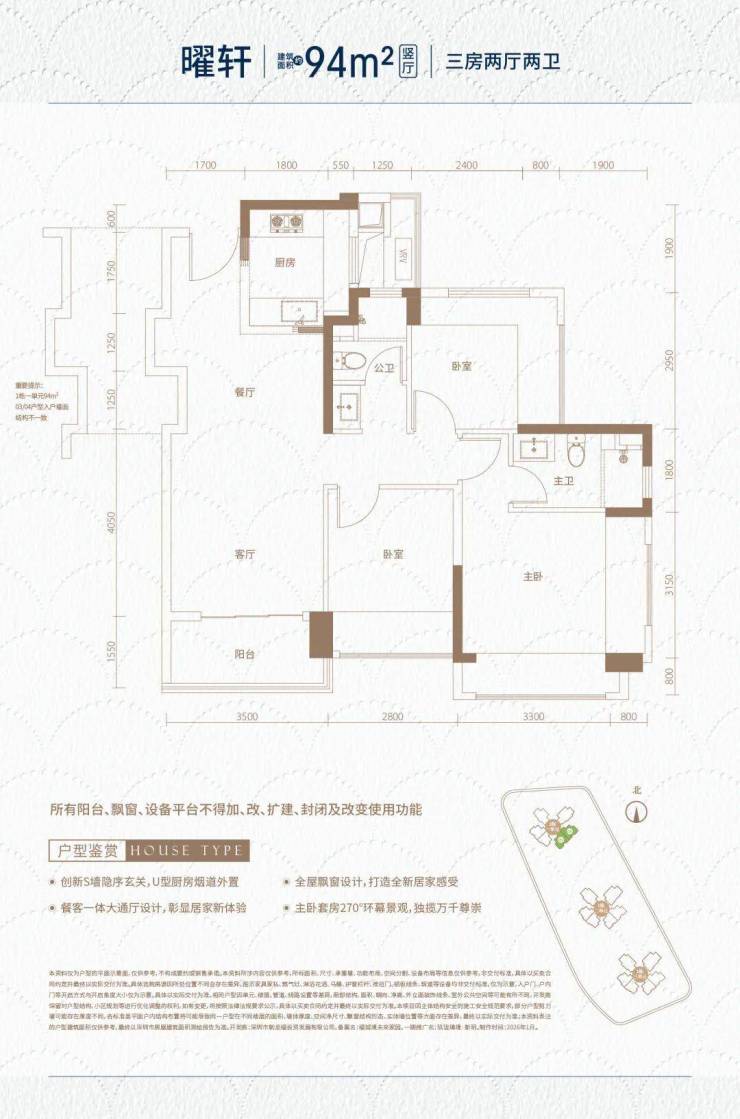1栋一单元603样板房,94㎡三房两卫,东南向