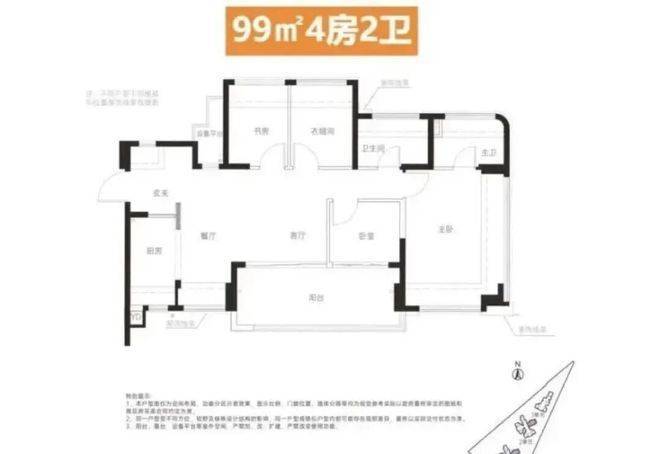 建面约99㎡ 4房2卫:横厅设计,客餐厅开间达5.35米,五开间朝南,主卧大套间,满足二孩或三代同堂的改善需求。