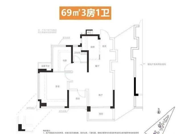建面约69㎡ 2+1房1卫:该户型实现了三开间朝南,采用LDKG+X一体化设计及S墙冰箱位,空间利用极致,是刚需上车红山的超性价比户型。