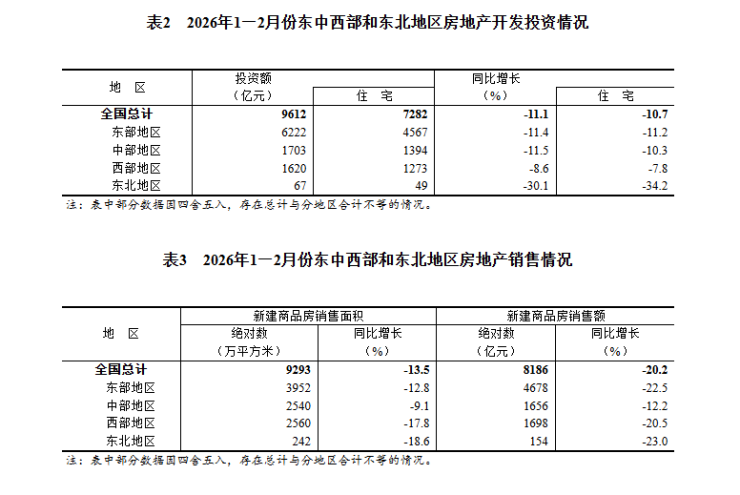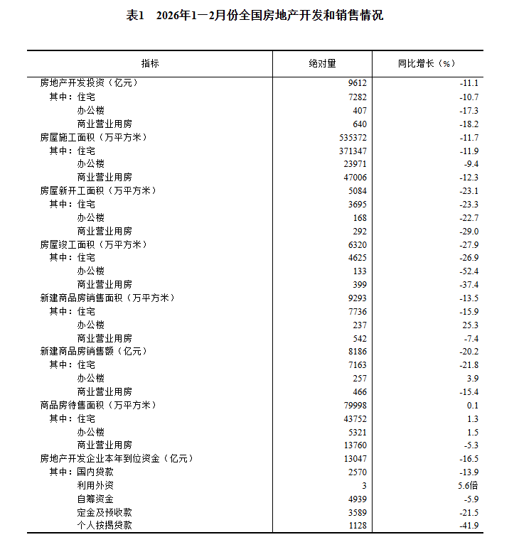 1—2月份,全国房地产开发投资9612亿元,同比下降11.1%(按可比口径计算,详见附注5),降幅比上年全年收窄6.1个百分点;其中住宅投资7282亿元,下降10.7%,降幅收窄5.6个百分点。