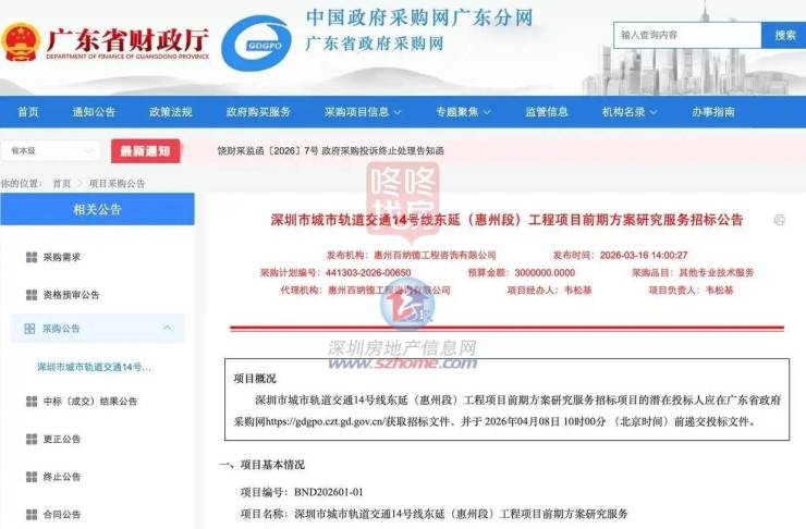 近日,广东省政府采购网正式发布深圳市城市轨道交通14号线东延(惠州段)工程项目前期方案研究服务招标公告。