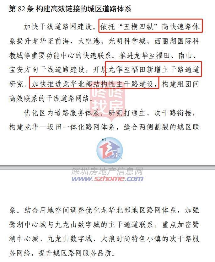 推进龙华至福田、南山、宝安方向干线道路建设,开展龙华至福田新增主干路通道研究。加快推进龙华北部结构性主干路建设,构建组团间高效联系的干线道路网络。